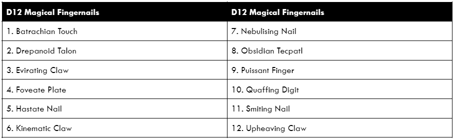 10. Quaffing Digit: Striated and porous like pumice. Allows the user to taste potions to determine their properties by placing their fingertip in the liquid. If tasting would ordinarily reduce the potency of the potion, it is not affected in this case, if the potion is poisoned, cursed or caustic the nail can be sacrificed instead of conferring its penalty to the victim - it turns black, shrivels up and drops off, allowing the victim's normal nail to eventually regrow.